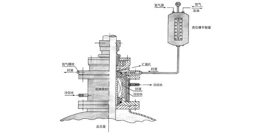 (2)該裝置多在負壓情況下配用,也可用在正壓工況,負壓時高位槽可不用通氣源,正壓時高位槽接通氣源,調(diào)整好壓力使高位糟及密封腔壓力與釜內(nèi)壓力處于相等或高于釜內(nèi)工作壓力0.05-0.1MPa為好。
